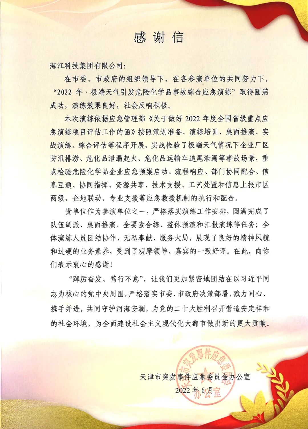 ? ? Recently, the Group received a letter of appreciation and an honorary trophy for outstanding contribution to the "2022 - Comprehensive Emergency Response Exercise for Hazardous Chemical Accidents Caused by Extreme Weather" from the Office of Tianjin Emergency Response Committee.