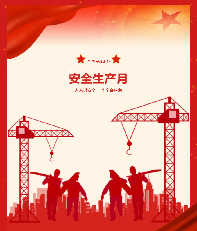 ? ? This June is the 22nd national production safety month, the theme of which is " to make everyone learn about safety, and everyone can be ready for emergency".?We should study and understand the important remarks of General Secretary Xi Jinping on safe production, promote the concept of safe development, implement the responsibility of safe production, carry out the inspection of major accident hazards, improve the safety awareness and emergency handling ability of all staff, make every effort to grasp the safety prevention work of the Group and each project department, and firmly stabilize and control the safety situation.