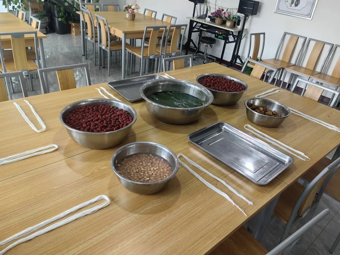 ? ? 在活動現(xiàn)場,大家早早準(zhǔn)備好了粽葉、糯米、花生、蜜棗以及包粽子所需要的盆、桶、線、剪刀等必需用品。
