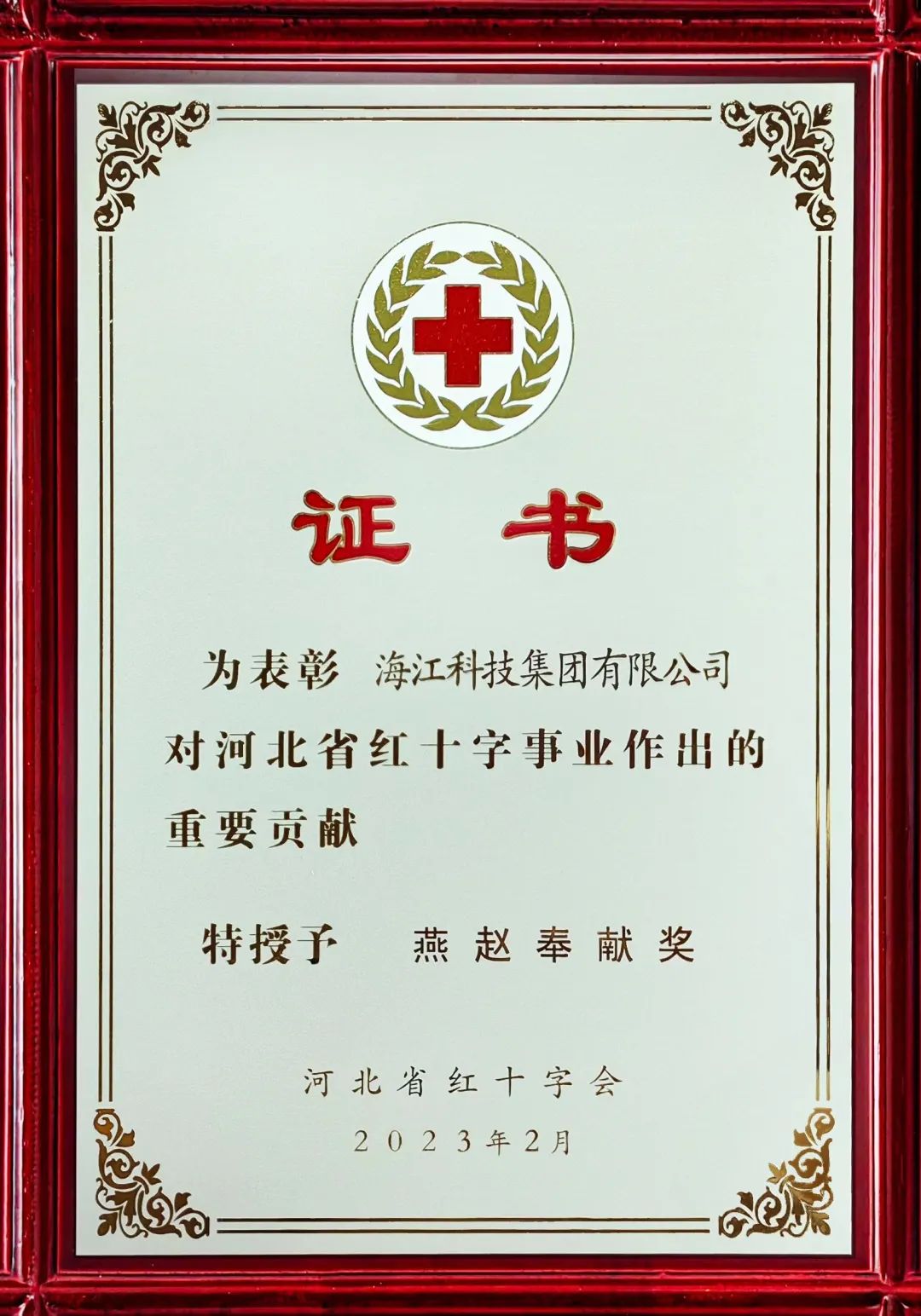 ? ? ? ? 近日,海江集團獲評河北省紅十字會“燕趙奉獻獎”,這是對海江集團積極履行社會責任的肯定與鼓勵。
