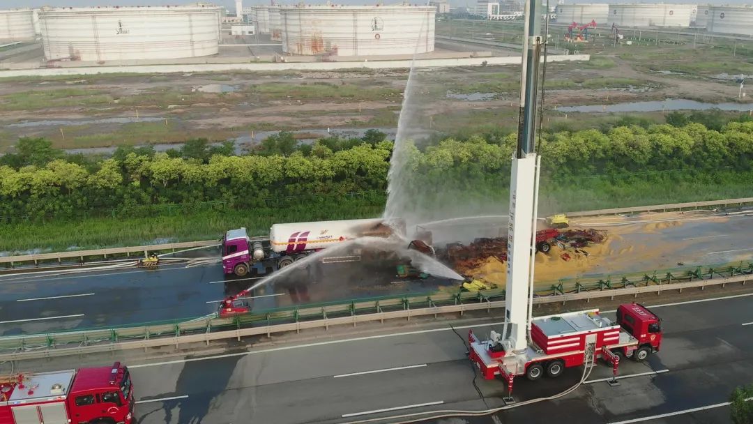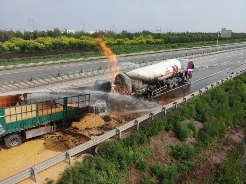 ? ? ? ? 8月3日下午1點49分,位于天津市濱海新區秦濱高速紅旗路互通立交附近處一輛液化氣槽車因碰撞發生泄漏起火事故,現場無人員傷亡。海江集團救援隊接到任務后迅速趕赴現場配合各部門進行處置。
