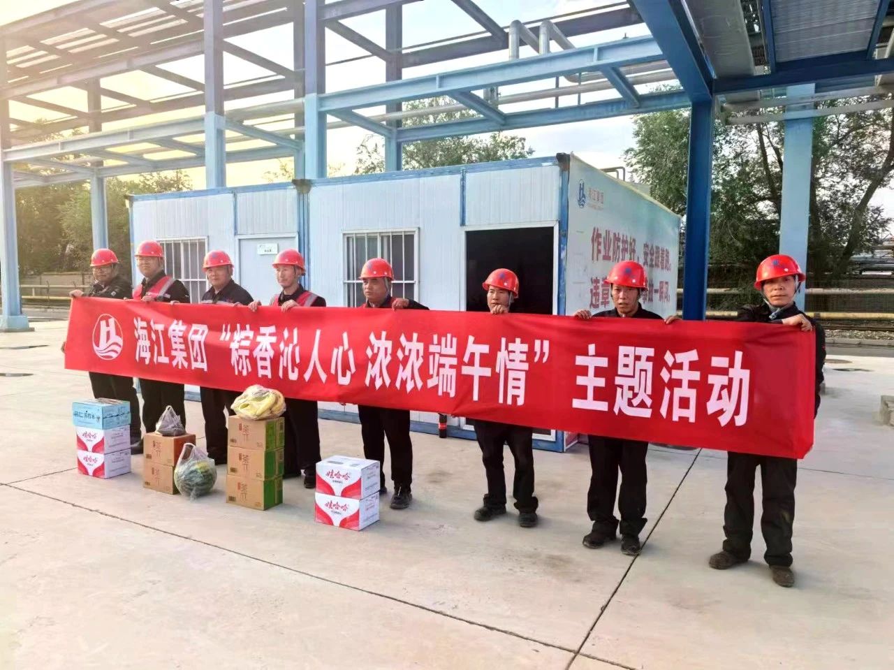 ? ? ? ? ? ?“明朝端午浴芳蘭,流香漲膩滿晴川”,對于那些在節日期間仍堅守崗位、無法與家人團聚的員工,海江集團也給予了特別的關懷。各地項目部負責人特別籌備端午禮物與問候,向他們表達了敬意和感謝,同時叮囑一線工人們將安全生產牢記心中,時刻把守紅線,將安全放在第一要位的同時做到高質量施工,完成計劃節點工期。