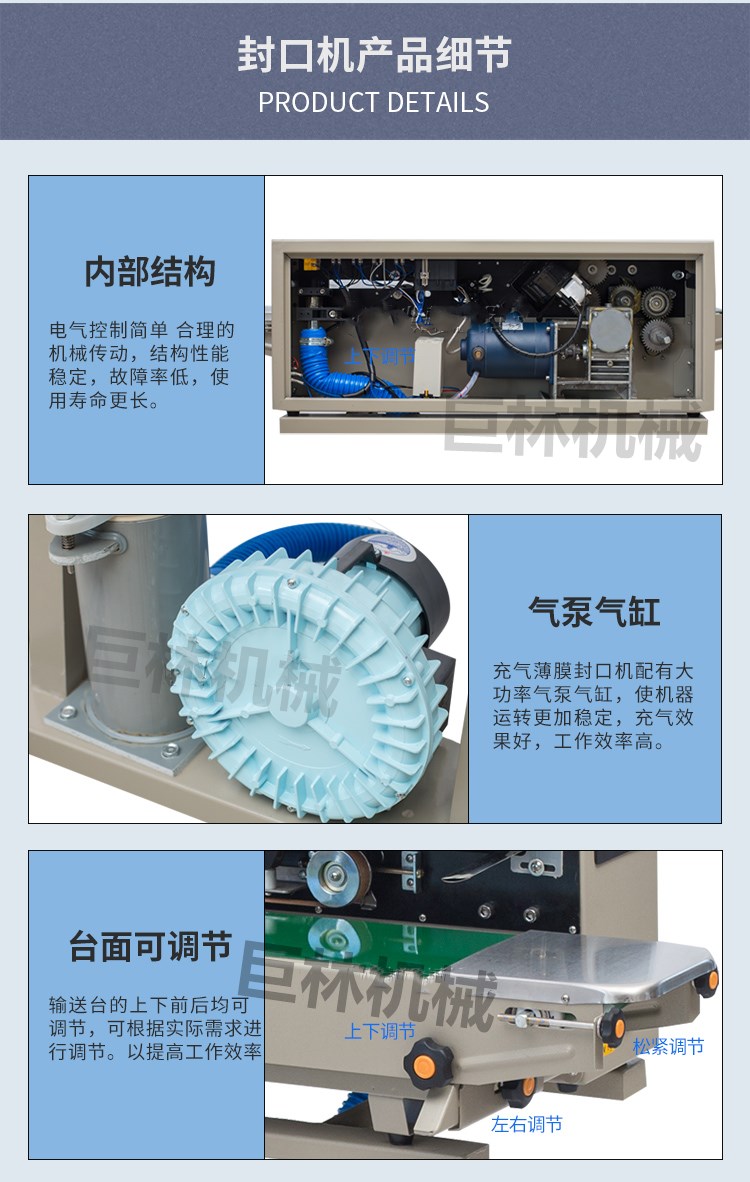 本機主要適用于膨化食品的包裝,是在自動薄膜封口機改進自動充氣裝置后的產品,塑料薄膜經過充氣包裝后提高了抗碎性,減少食品在運輸過程的損壞。